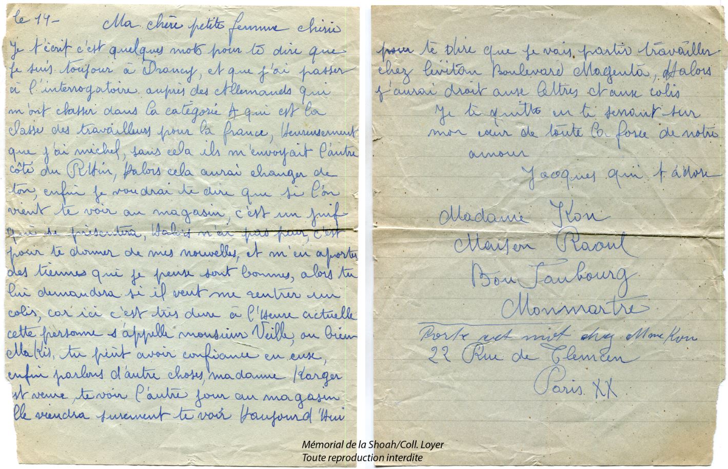 Si parla di mandare i bambini all'assistenza pubblica, vi prego abbiate pietà del mio bambino prediletto, reclamatelo e portatelo con voi sarà al sicuro perché siete francesi, e noi madri parliamo di mandarci in Polonia, non lo sopravviverò sicuramente ma almeno Aline vivrà, Non rifiutatemi, Aline è la mia unica ragione di vita. Vi prego, qui ci sono tutti i tipi di malattie che prenderà. Io sono già stanca, 5 notti che non dormo così tanto penso ad Aline. La mia faccia gialla fa pena a tutti, ma non possono fare niente perché non hanno ordine. Aron e Bella l'amate, proteggetela come una mamma perché avete figli e capite cosa vuol dire per una madre. Se va all'assistenza sociale, morirà e questo pensiero mi fa impazzire. Dorme per terra non sul legno la mattina mi reclama un biberon di latte e immagina il mio dolore quando non ne ho. Fai qualcosa per lei, reclamala. Non posso più scrivere, sono troppo debole. Bacio te e la mia piccola bambola.