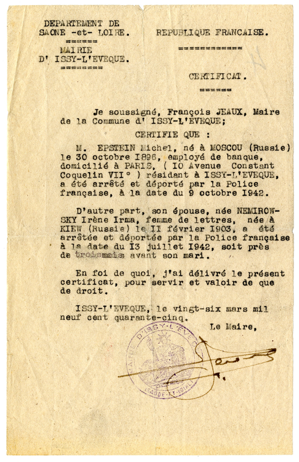 Certificato di arresto di Irène Némirovsky, firmato dal sindaco di Issy-l'Évêque, 26 marzo 1945.